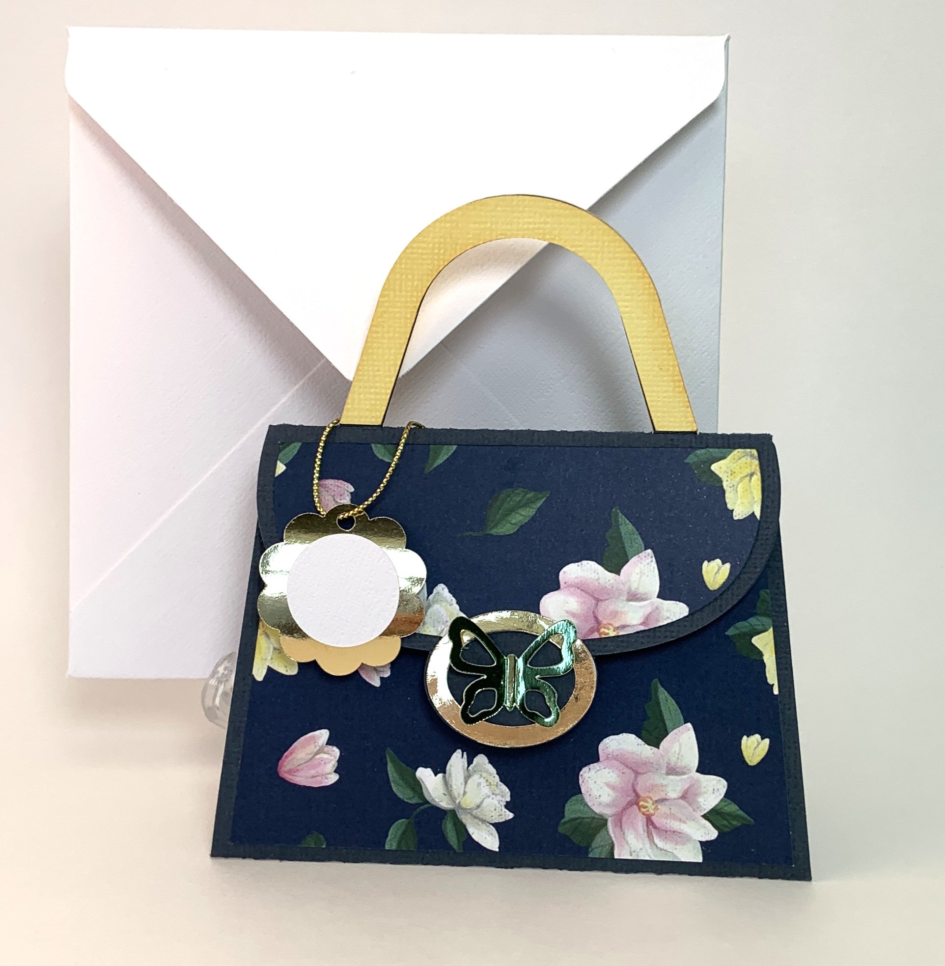 This pretty "purse" opens to reveal a slot for a gift card, as well as a spot to write a note. Includes small tag tied to handle to write your recipient's name. Crafted from 80 lb. textured cardstock and embellished pattern paper. Includes white envelope. Measures approx. 4.5" wide by 5" tall.